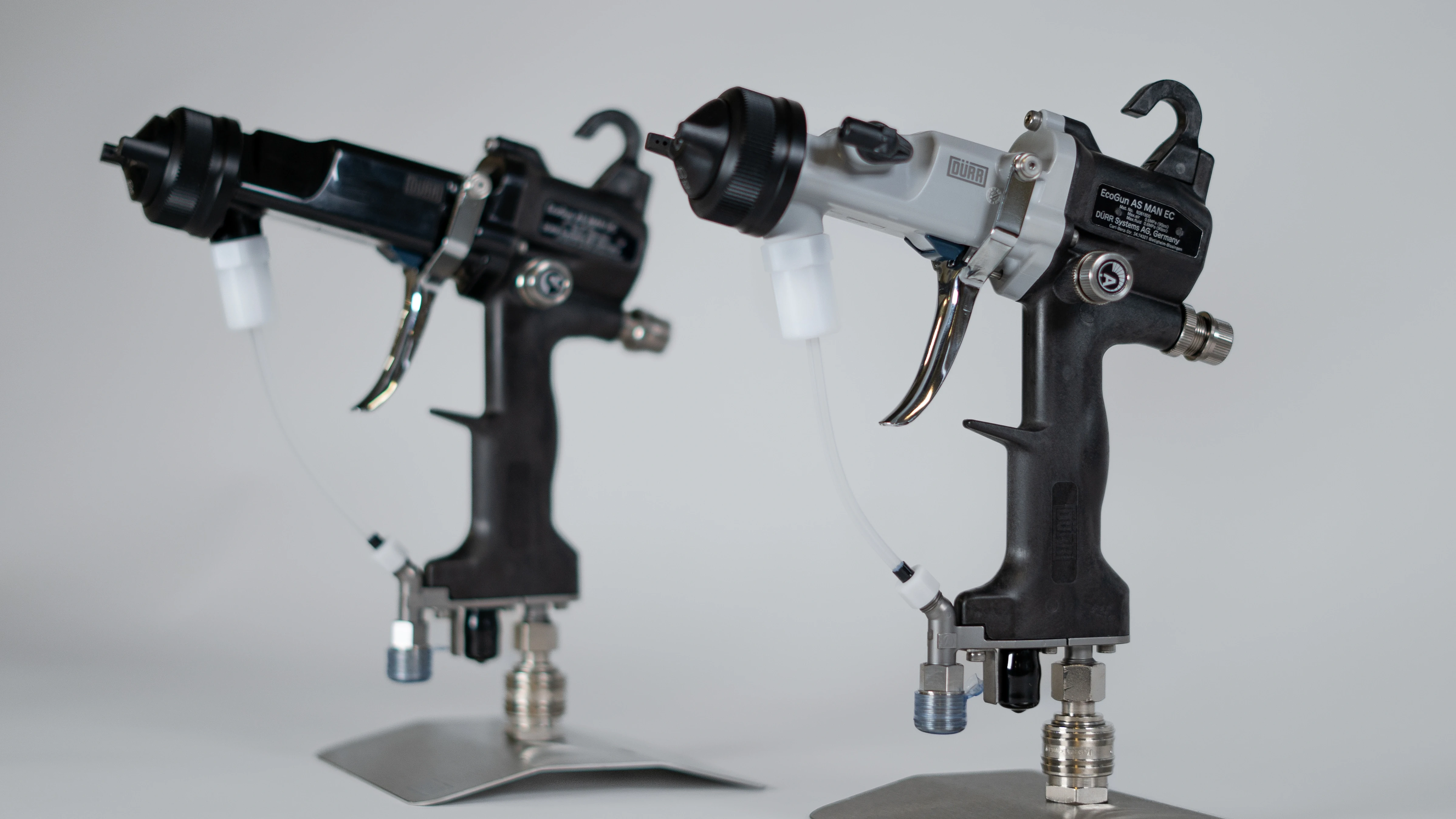 The EcoGun AS MAN EC is a more sustainable spray gun that reduces overspray up to 40 percent due to its electrostatic charging of paint and components. EcoGun AS MAN EC works with external charging, so the positively charged paint particles are attracted to the negatively charged workpieces. This new spray gun is ideal for manual painting of items such as tubes, rims, two-wheelers, or train parts.