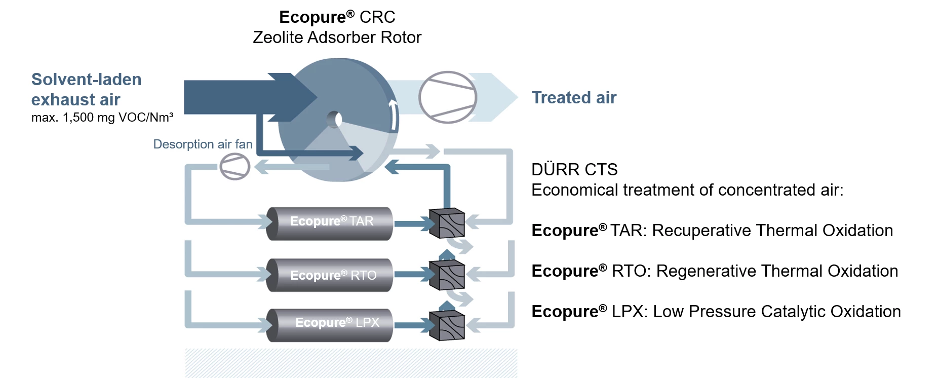 The anti-pollution control system consists of a filtering system for particulate removal, a disc concentrator system for selectively adsorbing and concentrating volatile organic compounds (VOCs), as well as a RTO combustion system that treats the small volume flow of concentrated HAPs. The RTO system provides an energy-saving technology that reduces energy consumption by 95% or more by utilizing recovering heat from a ceramic media mounted inside the RTO. In addition, the consumption of primary energy can be drastically reduced if the calorific value and concentration of the VOCs and HAPs is sufficiently high. The volume flow is 5400 ACMM and the whole building needs ventilation.