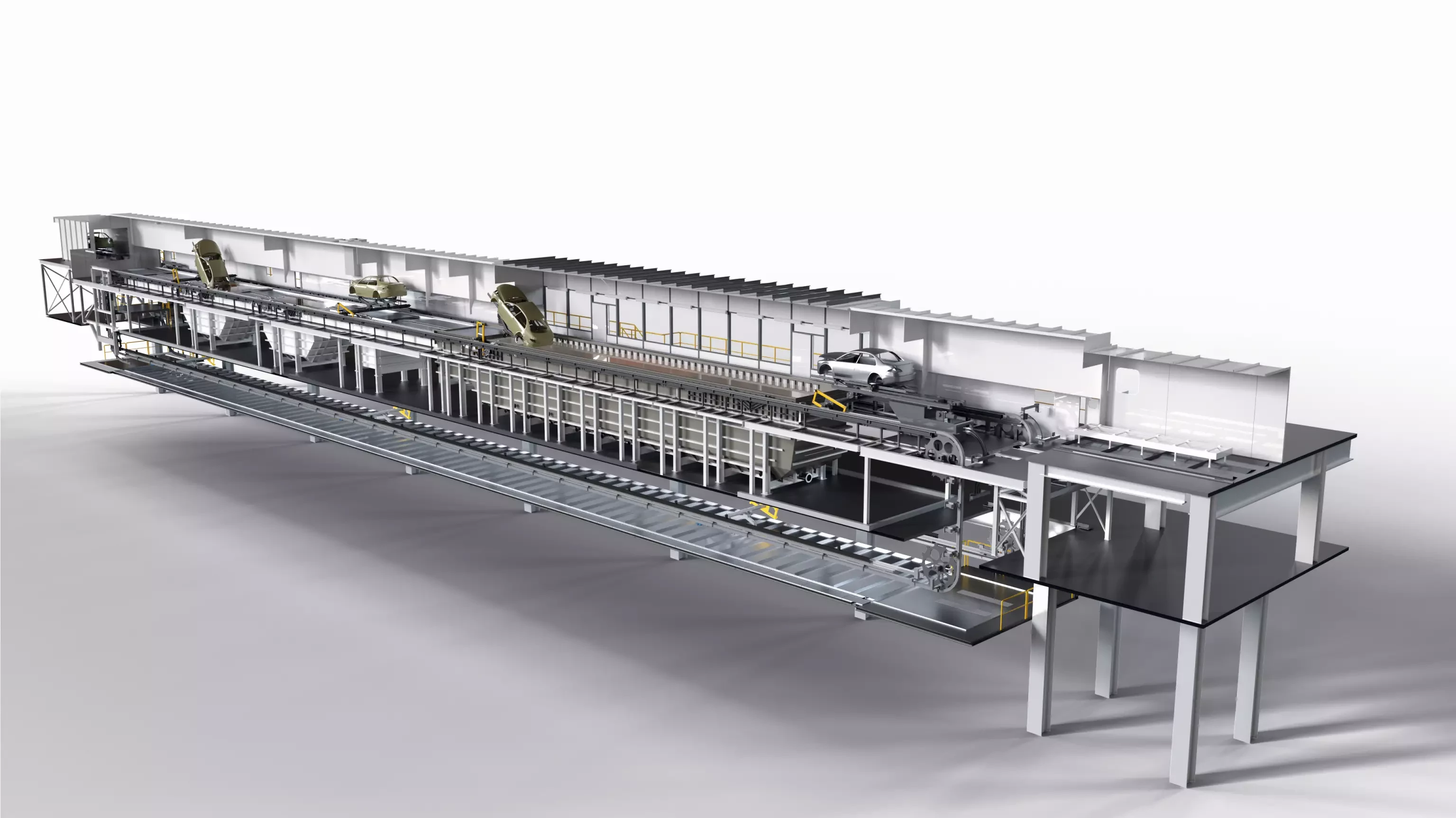 BMW is using an integrated skidless conveyor system for the first time in the new plants in Debrecen and Tiexi. Here, the bodies are transported through the plants exclusively on traverses. This means that no space is required for return transport of the skids and there is no need to clean skids in the top coat section. The end result is compact and scalable layouts.