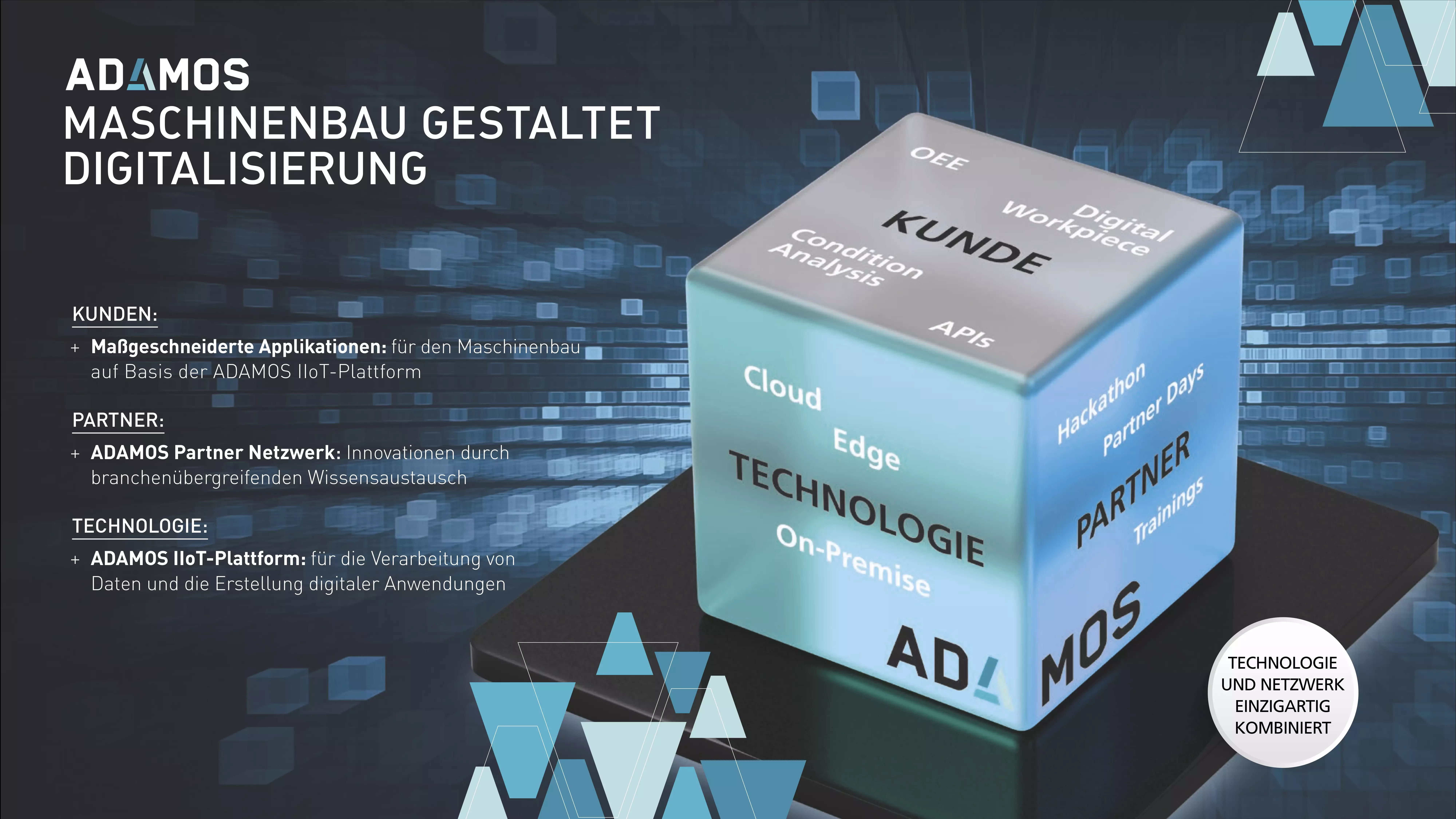 ADAMOS ist eine offene und herstellerneutrale IIoT-Plattform speziell für den Maschinenbau und seine Kunden. Sie ermöglicht den Nutzern von Maschinen und Fertigungsanlagen eine einfache Digitalisierung ihrer Produktion. Über die ADAMOS-Plattform lassen sich Maschinen vernetzen, sodass sie Informationen über das Internet austauschen können. Mithilfe der über ADAMOS generierten Daten können Anwender digitale Services nutzen und so die Effizienz ihrer Produktion steigern. Beispiele sind Apps für die vorausschauende Wartung oder die Optimierung der Maschinenauslastung.