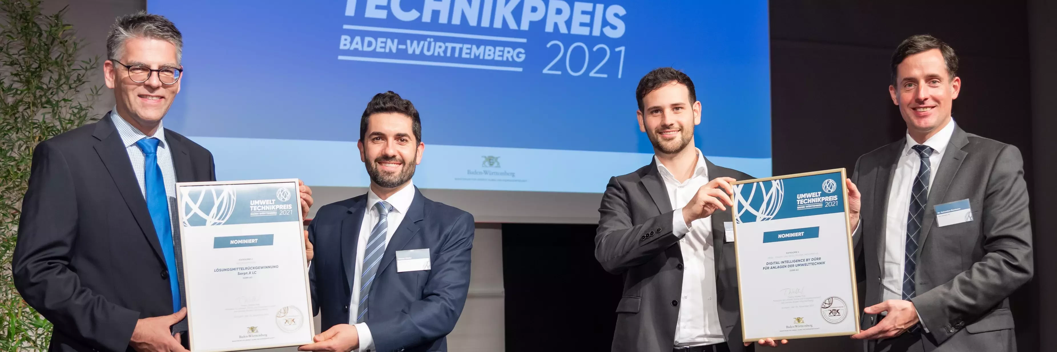 Mit dem Umwelttechnikpreis zeichnet das Ministerium für Umwelt, Klima und Energiewirtschaft Baden-Württemberg herausragende Innovationen in der Umwelttechnik, in insgesamt vier Kategorien, aus. Dürr überzeugte dabei mit Sorpt.X LC in der Kategorie Materialeffizienz und mit DXQ für Abluftreinigungsanlagen in der Kategorie Mess-, Steuer- und Regeltechnik, Industrie 4.0.