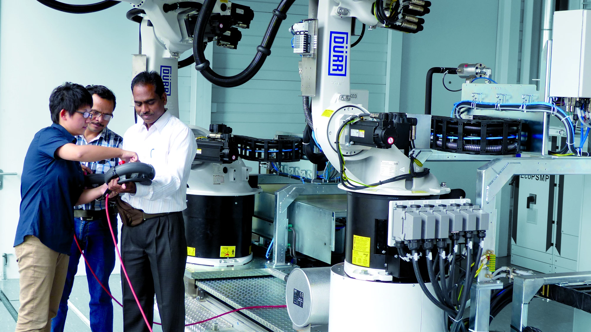 Im hochmodern ausgestatteten Schulungszentrum am Dürr-Standort in Bietigheim-Bissingen erwartet Wartungs- und Instandhaltungspersonal, Anlagenbediener, Programmierer, Führungskräfte und Planungsgruppen ein breites Spektrum an Schulungen. Ein Team von 16 Trainern unterschiedlicher Fachrichtungen macht die Teilnehmer mit der fachgerechten Bedienung der Dürr-Roboter vertraut, vermittelt Wissen zur eingesetzten Applikationstechnik und erläutert technische Spezialaspekte, beispielsweise zur elektrischen Instandhaltung der Anlagen. Vertieft wird das neu erlernte Wissen mit praktischen Übungen hinsichtlich Wartung, präventiver Instandhaltung, aber auch Trouble-Shooting.
