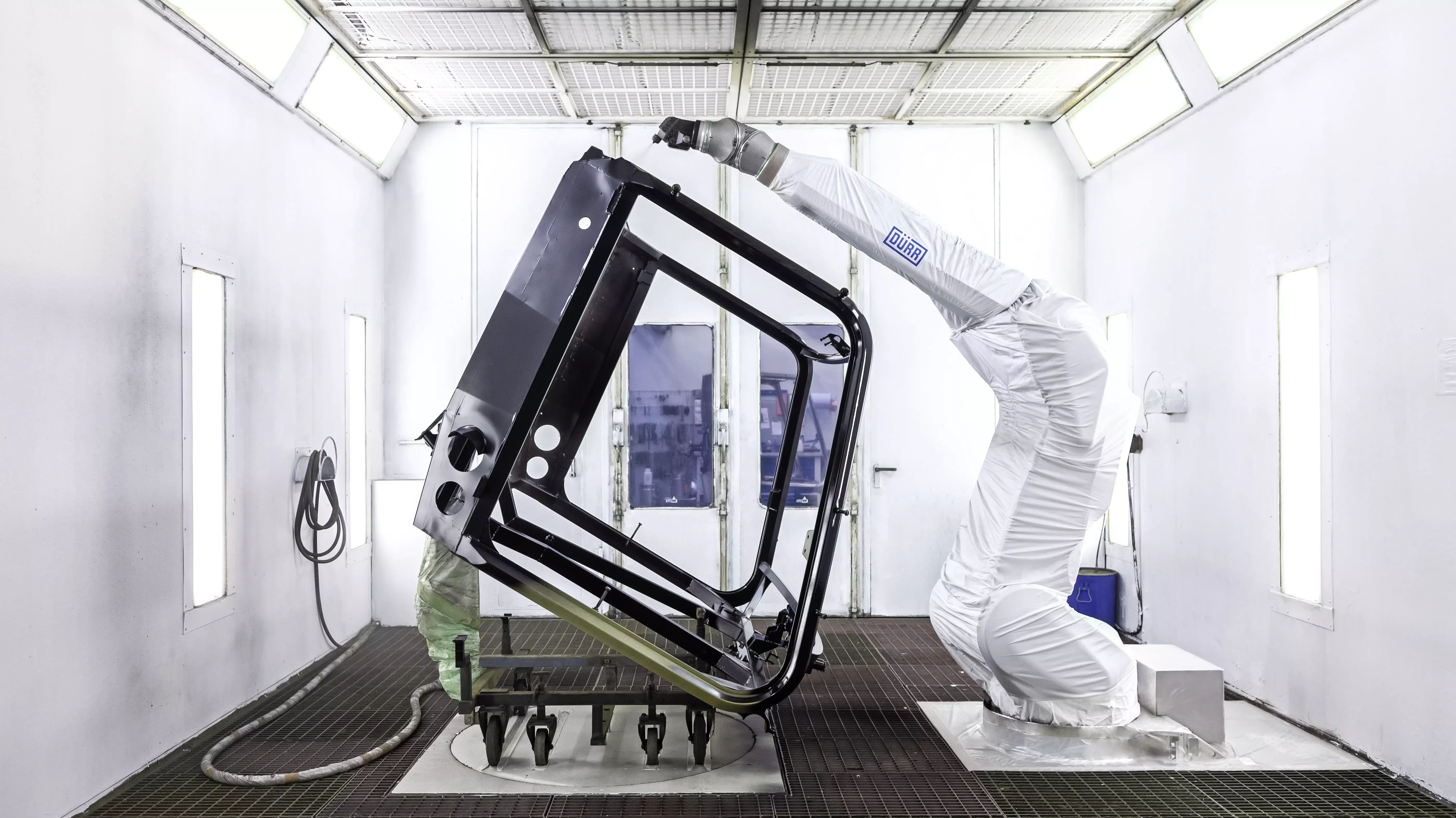 • Ein automatisches Dreh- und Kippgestell bringt die Karosserie in die richtige Lackierposition.