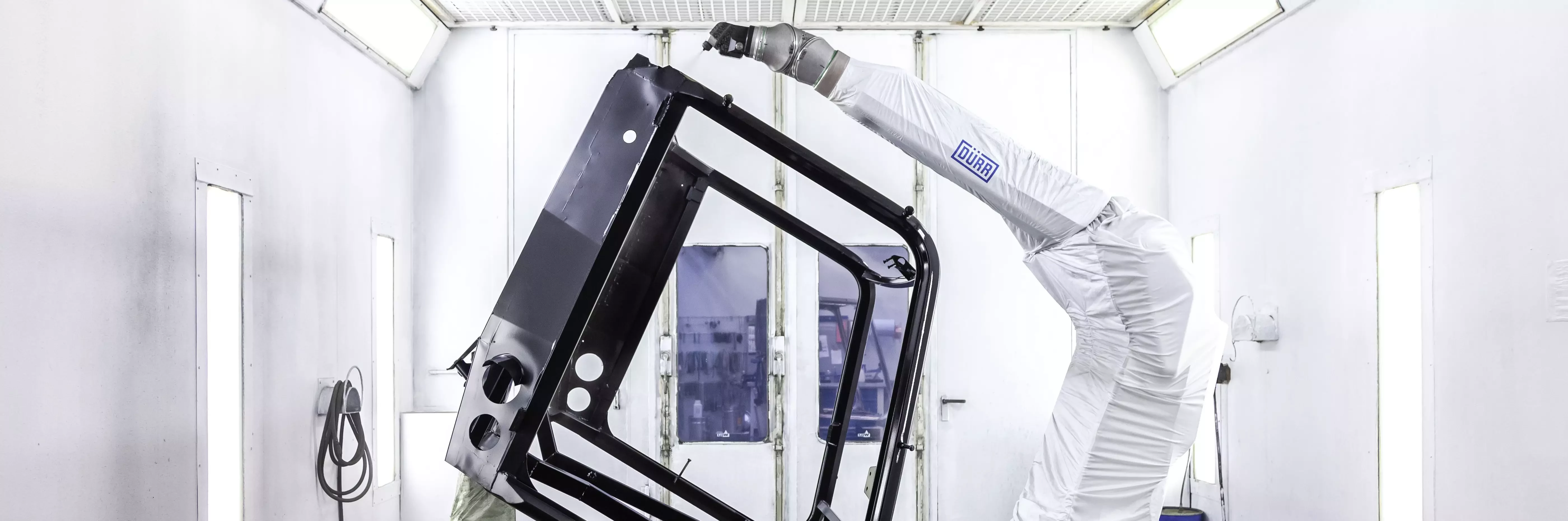 Temperaturen unter dem Gefrierpunkt, scharfkantige Eiskristalle, starke UV-Bestrahlung: Beim Einsatz auf Pisten und Loipen sind die Oberflächen der Fahrerkabinen von PistenBullys härtesten Bedingungen ausgesetzt. Zum Schutz vor den rauen Umwelteinflüssen werden zwei Füllerschichten sowie der Basislack aufgebracht – durch einen Lackierroboter des Typs EcoRP L033 von Dürr, der die Metallrahmen von außen und innen beschichtet. „Für die Lackierung eines Fahrerhauses benötigt der Roboter höchstens eine Stunde. Im Vergleich zur bisherigen Handlackierung spart uns das so viel Zeit, dass wir die Ausbringrate auf 600 Fahrerhäuser pro Jahr deutlich steigern können“, sagt Uwe Thierer, Werkleiter am Standort Laupheim der Kässbohrer Geländefahrzeug AG.