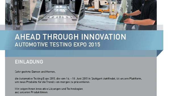 AHEAD THROUGH INNOVATION AUTOMOTIVE TESTING EXPO 2015, 16. - 18. Juni 2015 in Stuttgart Die Automotive Testing Expo 2015, die vom 16. - 18. Juni 2015 in Stuttgart stattfindet, ist unsere Plattform, um neue Produkte für die Trends von morgen zu präsentieren. Wir zeigen Ihnen innovative Lösungen und…