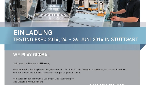 Testing Expo 2014 24. - 26. Juni in Stuttgart, Halle 1, Stand 1624 We play global . Die Automotive Testing Expo 2014, die vom 24.-26. Juni 2014 in Stuttgart stattfindet, ist unsere Plattform, um neue Produkte für die Trends von morgen zu präsentieren. Wir zeigen Ihnen innovative Lösungen und…