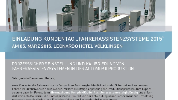 Kundentag Fahrerassistenzsysteme 2015 5. März 2015, Hotel Leonardo Völklingen Prozesssichere Einstellung und Kalibrierung von Fahrerassistenzsystemen in der Automobilproduktion. Sehr geehrte Damen und Herren, seien Sie herzlich eingeladen zu unserem Kundentag Fahrerassistenzsysteme. Wir präsentieren…