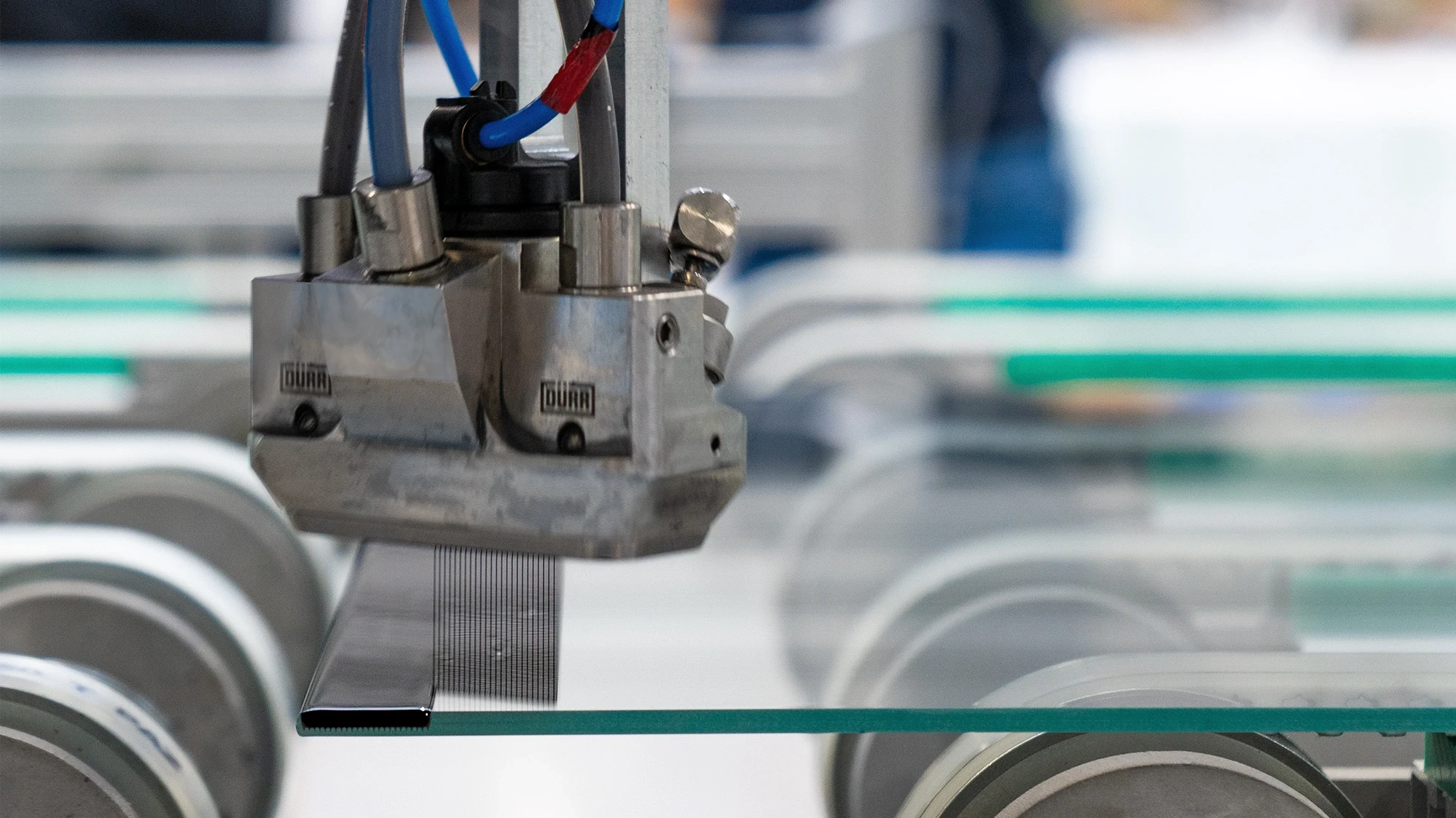 We are all familiar with large refrigeration units from supermarkets: wall shelving, cabinets, or counters, behind whose glass or plastic panels a wide range of foodstuffs are stored. PAN-DUR uses enhanced safety glass (ESG) for its glass elements. Opaque decorative stripes are applied to obscure the unsightly bonded and sealed seams at the edges of the glass and the refrigeration technology behind them. Until now, PAN-DUR used a screen printing process for this, which required a new screen or template for every color, size, or design variation.