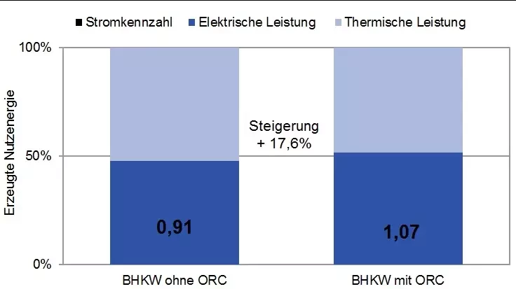 The CHP remuneration results from the sum of the externally used heat multiplied by the power to heat ratio and by the CHP bonus. This means that the remuneration automatically rises when the power to heat ratio is increased by the ORC system.