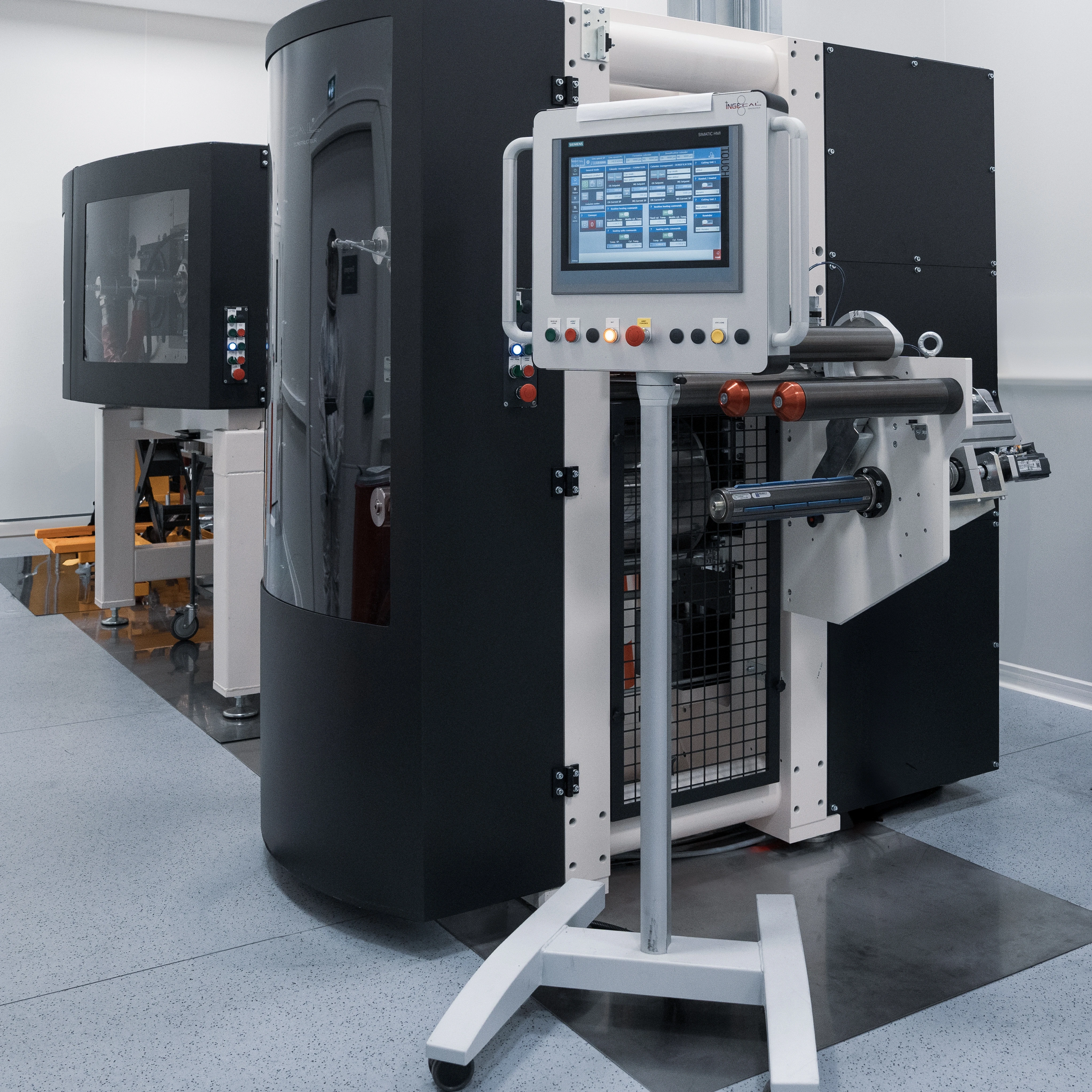 Unlike in the conventional process, the battery material is not applied as a paste, but as a powder pressed into a stable film using the Activated Dry Electrode® process developed by our development partner LiCAP Technologies. This film runs through the system free-standing without a collector foil and can be completely returned to the material cycle if necessary, reducing production waste.