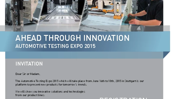 AHEAD THROUGH INNOVATION AUTOMOTIVE TESTING EXPO 2015, 16th to 18th June 2015 in Stuttgart The Automotive Testing Expo 2015, which takes place in Stuttgart, Germany, from 16th to 18th June 2015, is our present new products for tomorrow's trends. We will show you innovative solutions and technologies…