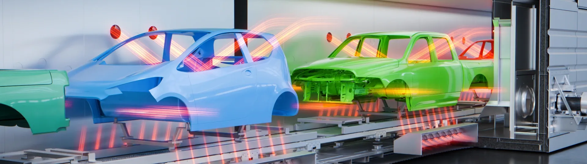 EcoSmartCure ofrece múltiples posibilidades de diseño de las plantas de pintura de automóviles. La conducción de aire optimizada para CFD dirige el aire con exactitud allí donde se necesita para calentar la carrocería. De este modo, el concepto de boquilla de EcoSmartCure también permite calentar rápidamente y de manera homogénea estructuras complejas de carrocerías, p. ej., de vehículos eléctricos.