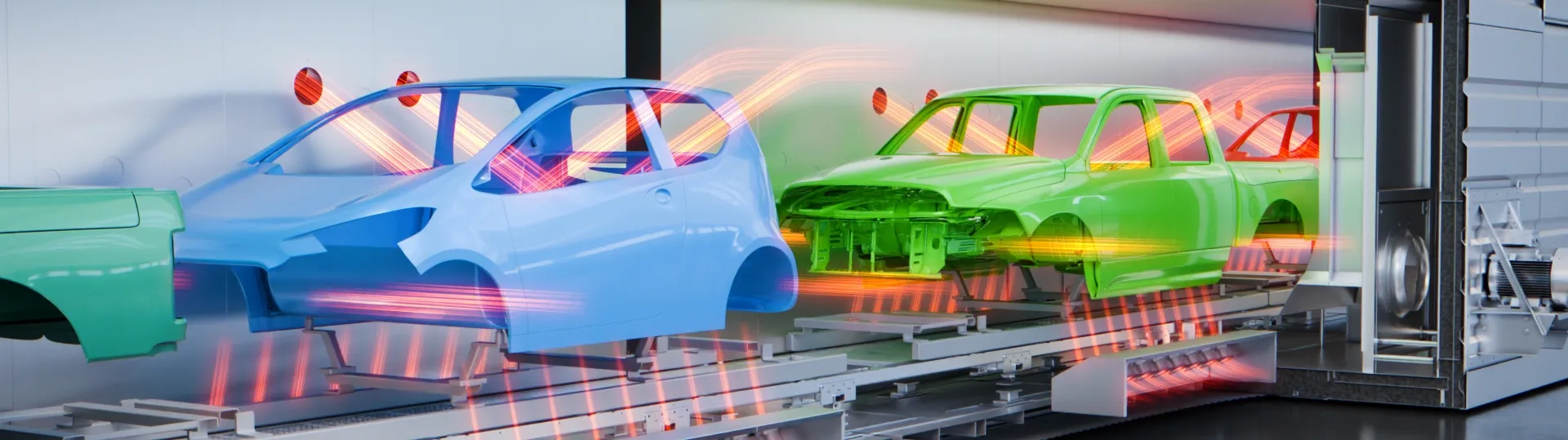 EcoSmartCure offre de nombreuses possibilités de configurations d’ateliers de peinture dans le secteur automobile. Le flux d'air optimisé en termes de CFD garantit une mise à disposition ciblée de l'air exactement là où il est requis pour chauffer la carrosserie. Le concept de buses de l'EcoSmartCure est ainsi en mesure d'amener même des carrosseries complexes telles que celles des véhicules électriques à la température requise de manière rapide et régulière.