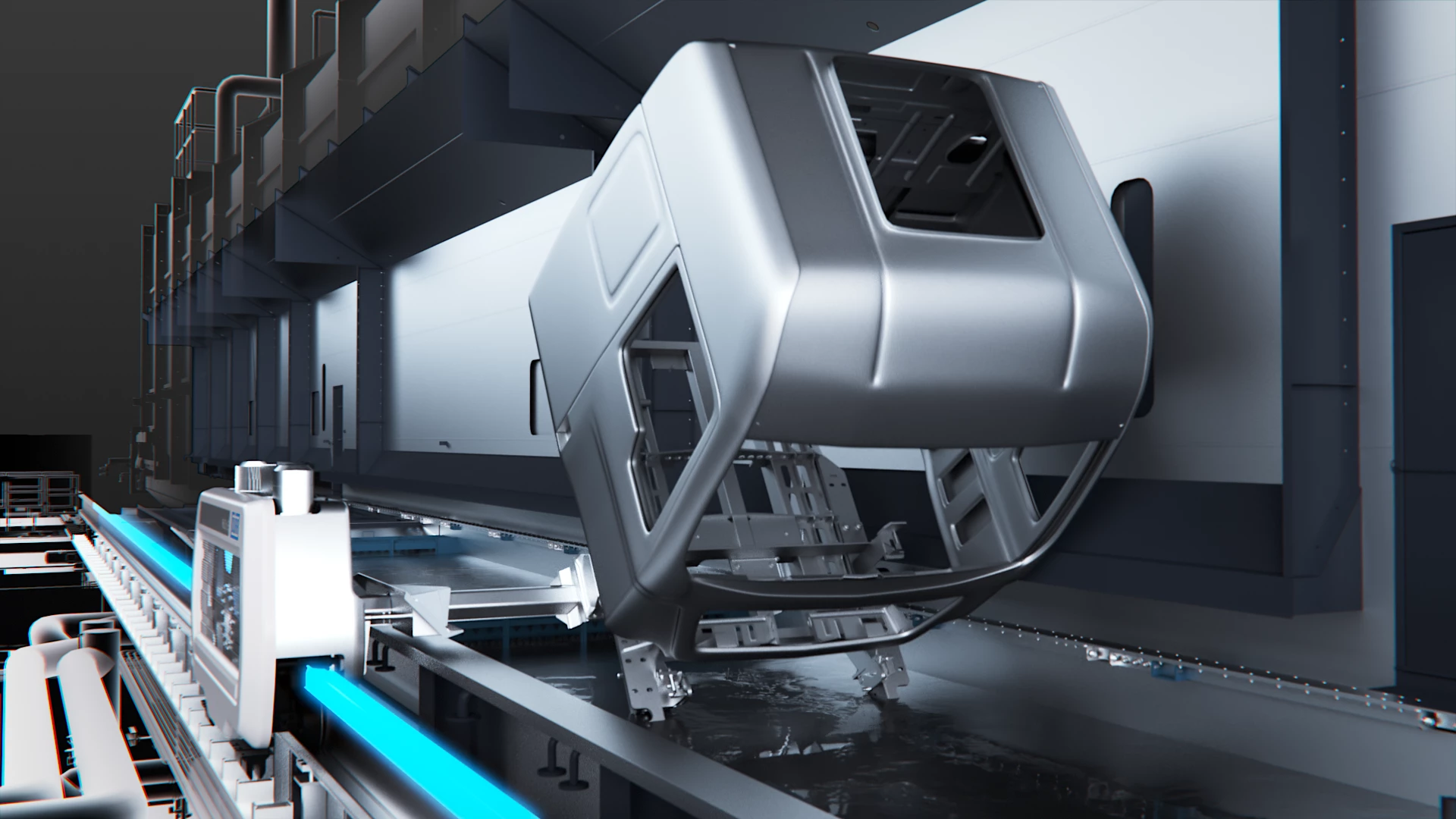 At the beginning of the painting process, the RoDipยฎ rotational dip process provides the optimal prerequisites for subsequent processes. The electric variant RoDipยฎ E permits individual dip curves for pretreatment (PT) and cathodic electrocoating (EC), which optimize the coating quality when dealing with different cab models. With this method, each cab is transported through the complete PT and EC process using a freely programmable trolley. Each trolley has a conveying drive and a rotating drive, which enable horizontal and rotating movements to be controlled independently of each other for each cab. The immersion tanks for the rotational process are smaller than with a traditional pendulum conveyor, which means that less energy and chemicals are required. This saves resources and reduces operating costs.