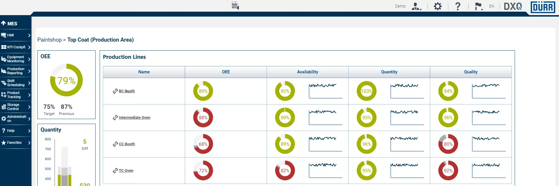 Every decision-making process requires different data as a basis. To get the right overview, the user can navigate purposefully with DXQbusiness.intelligence: across the entire site, limited to specific production areas such as cathodic electrocoating or focused on individual lines like the cathodic electrocoating dryer. For production, the overall equipment effectiveness (OEE) as well as quality and quantity data is displayed, and for individual lines within the production area additionally the temporal progressions of the above-mentioned key figures.