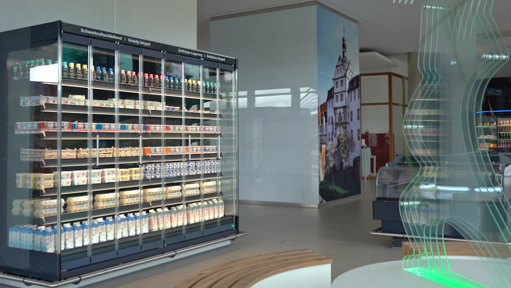 Wszyscy doskonale znamy ogromne urządzenia chłodnicze z supermarketów: regały, szafy lub lady, które za swoimi panelami ze szkła lub tworzyw sztucznych mieszczą całą gamę produktów spożywczych. Do wykonywania elementów szklanych PAN-DUR wykorzystuje wzmocnione szkło hartowane (ang. Enhanced Safety Glass, ESG). Natomiast matowe paski dekoracyjne służą do zakrycia nieestetycznych klejonych i uszczelnionych szwów na krawędziach szkła oraz technologii chłodniczej, która ukryta jest za nimi. Do tej pory firma PAN-DUR stosowała do tego celu sitodruk, co wymagało przygotowania nowego sita lub szablonu dla każdego koloru, rozmiaru lub wariantu projektu.