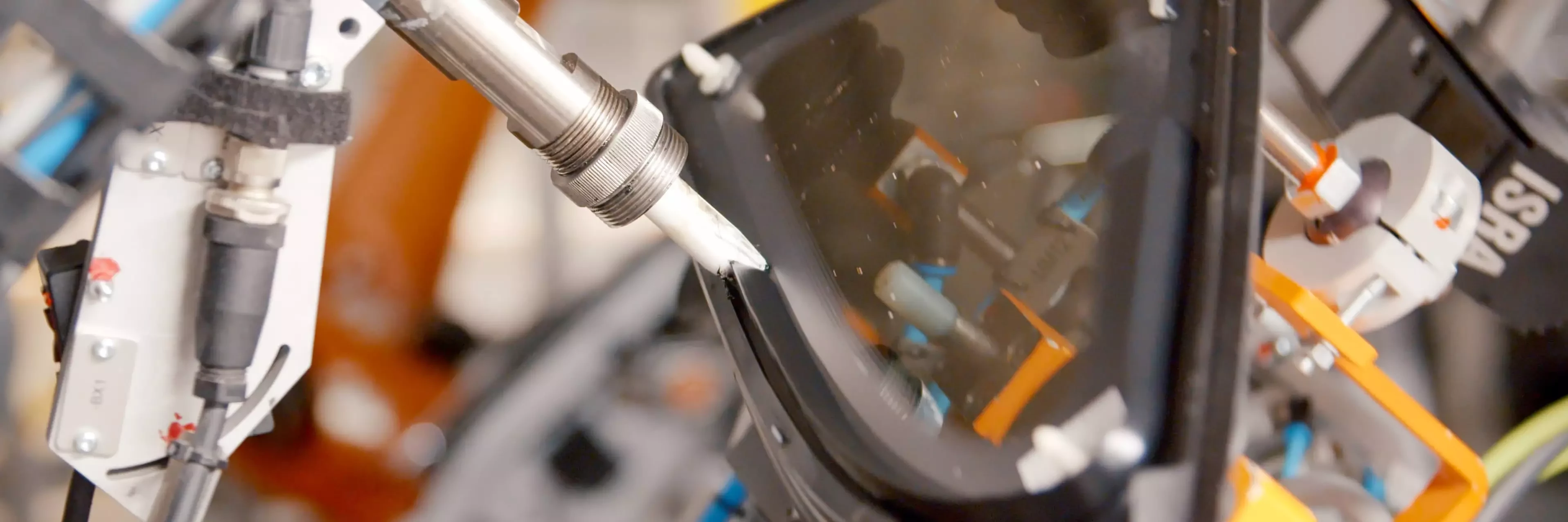 O centro de colagem de vidros do Kit de Ferramentas de Eletrificação Modular (MEB) passou por grandes implementações de automação durante a modernização da fábrica. No futuro, tudo ocorrerá de forma totalmente automática: a alimentação das janelas grandes a partir de contêineres de transporte sequenciados e das janelas laterais a partir de contêineres de transportes específicos pelo módulo de logística, com a aplicação de cola e inserção das janelas grandes em células e das janelas laterais em operação contínua na linha de montagem. Anteriormente, a inserção automatizada das janelas laterais só era possível em modo “stop and go” (parar e recomeçar). O processo de sincronismo de linha desenvolvido em estreita colaboração com a Volkswagen muda essa realidade, mantendo as carrocerias em movimento em plataformas skillet enquanto robôs inserem e colam as janelas laterais. Um dos benefícios é a grande redução de custos, pois a tecnologia de transportadora não precisa mais se adaptar à operação de células. Além disso, o local pode ser selecionado com flexibilidade, já que é possível integrar o sistema de colagem das janelas laterais em qualquer ponto da linha de montagem.